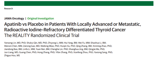 2021年12月16日,权威医学杂志《JAMA Oncology》(影响因子31.777)在线发表阿帕替尼的一项III期临床研究(REALITY)——甲磺酸阿帕替尼片治疗局部进展/转移性放射性碘难治性分化型甲状腺癌(RAIR-DTC)患者的多中心、随机、双盲、安慰剂对照临床研究。此研究由北京协和医院的林岩松教授和南京金陵医院的秦叔逵教授发起,在全国21个研究中心展开,由AG百家乐医药中央医学事务部团队支持完成。